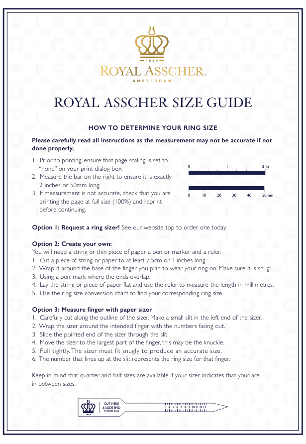 We’re here to help. At Royal Asscher, we know that every fine piece begins with the perfect fit. That’s why we offer two easy ways to measure your ring size.